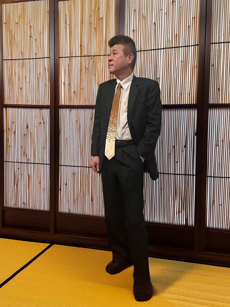 気流に乗って旋回する【サシバのタカ柱】をデザイン。 このネクタイを身につければ、サシバの渡りを目撃したときの胸の高鳴りをいつでも思い出せることでしょう。